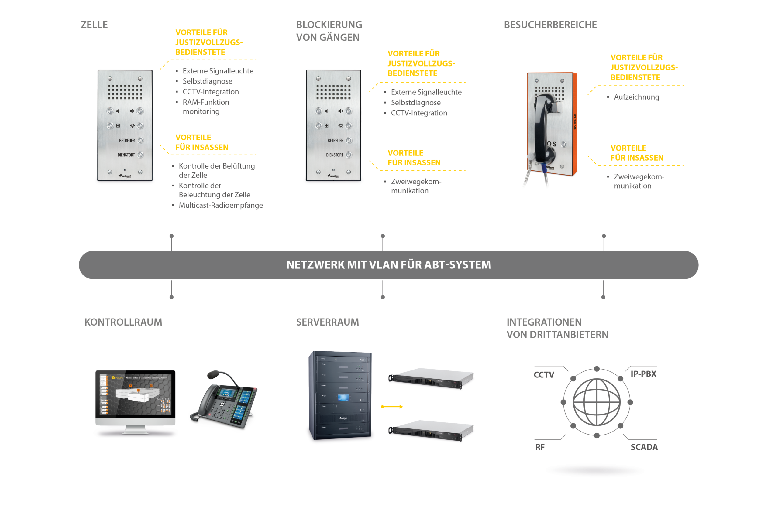 Das System ermöglicht das Fernabhören von Audio aus Zellen, die Aufzeichnung von Gesprächen, die Steuerung von Beleuchtung und Belüftung sowie die Integration mit CCTV-, BMS- und SCADA-Systemen.